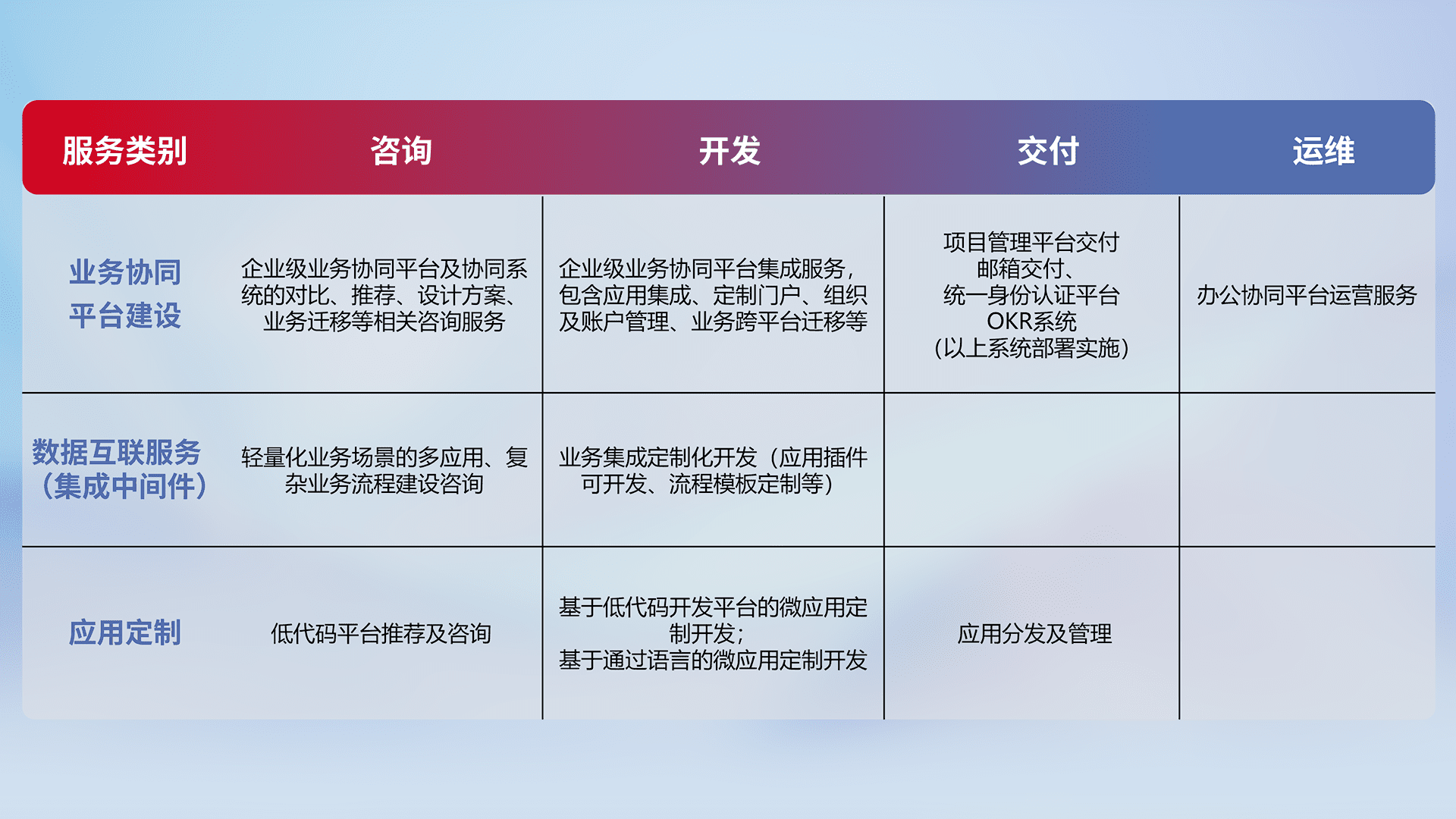 针对钉钉、、、、企微、、、IDaas等平台级产品提供产品的规划、、、、方案、、、交付、、、定制化开发等服务,,,,实现如统一协同办公、、智能客户服务、、、混合会议管理、、、、智能数据查询、、等业务场景,,,,实现数字化转型。。