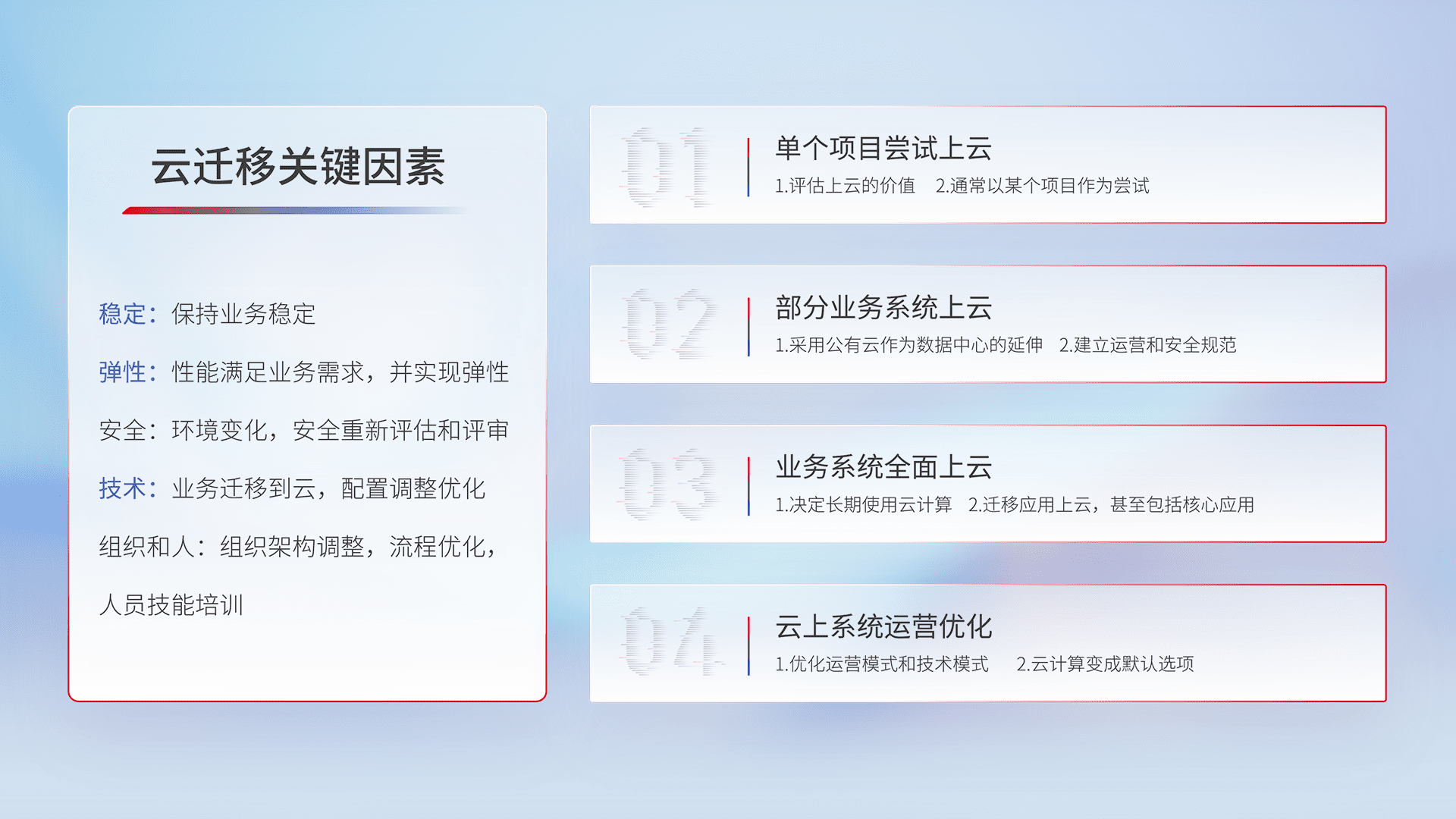 结合实际业务,,从规划设计、、、、云平台选型、、、、云原生改造、、数据迁移、、、、集成交付,,迁移全过程为客户识别最佳上云路径,,做好风险识别管理,,,设计网络架构、、、、身份权限、、、安全审计合规、、、操作审计、、日志审计、、监控告警策略、、、、多站点容灾设计等,,对云上基础设施进行整体规划,,提升IT治理水平,,以满足弹性、、高可用、、高性能的需求。。