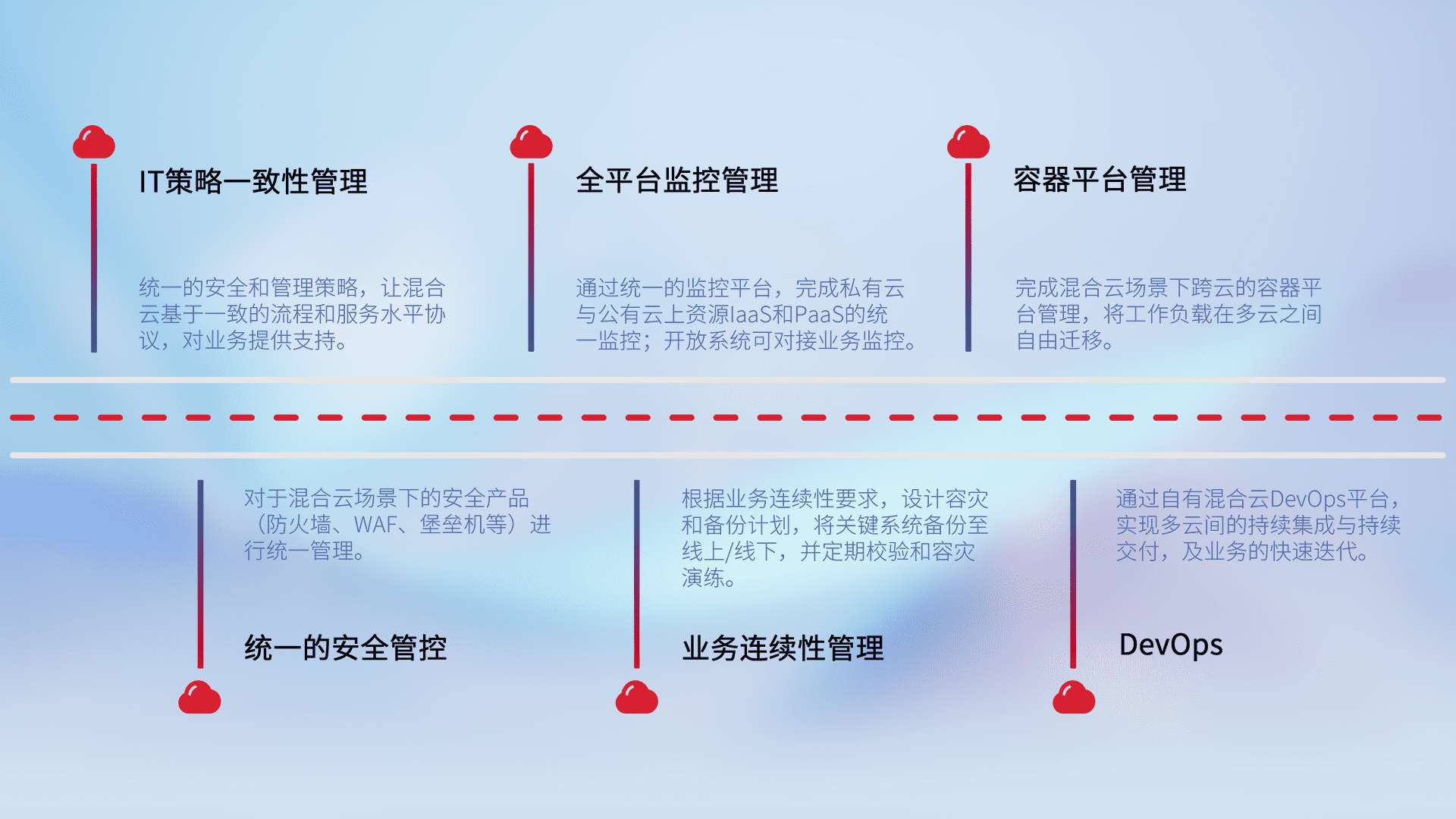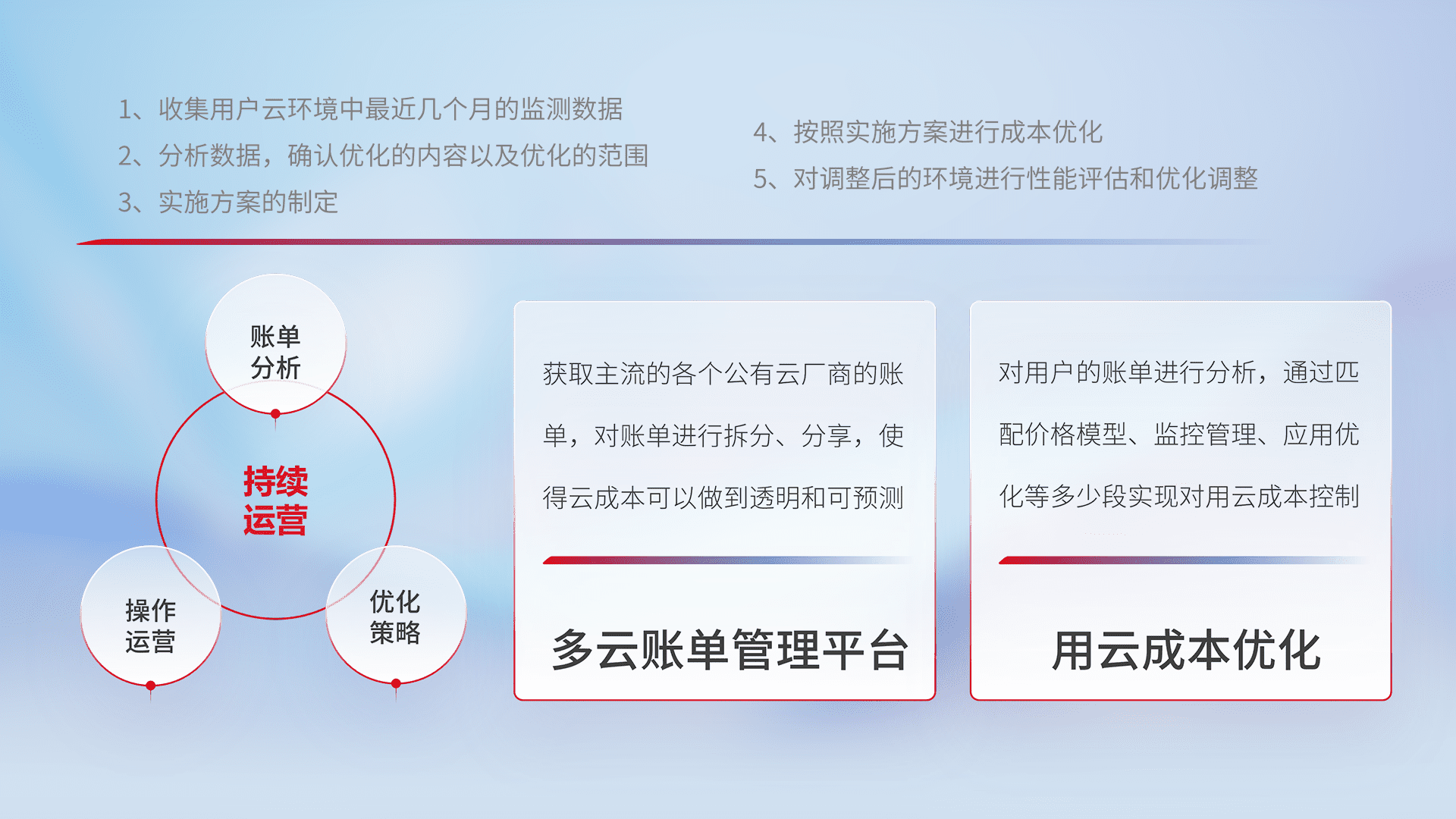 通过多云纳管,,以统一的资源数据模型把客户的云资源进行抽象和封装,,,,进而实现对多云资源的统一操作,,保障云资源管理的可靠性、、、、稳定性与可用性。。。量身定制化运维内容,,配置、、、、开发运维、、、、补丁管理、、、、备份、、监控、、、认证和访问管理、、审计和日常巡检等,,,保障在用云过程中的可靠度,,稳定度以及高可用率。。