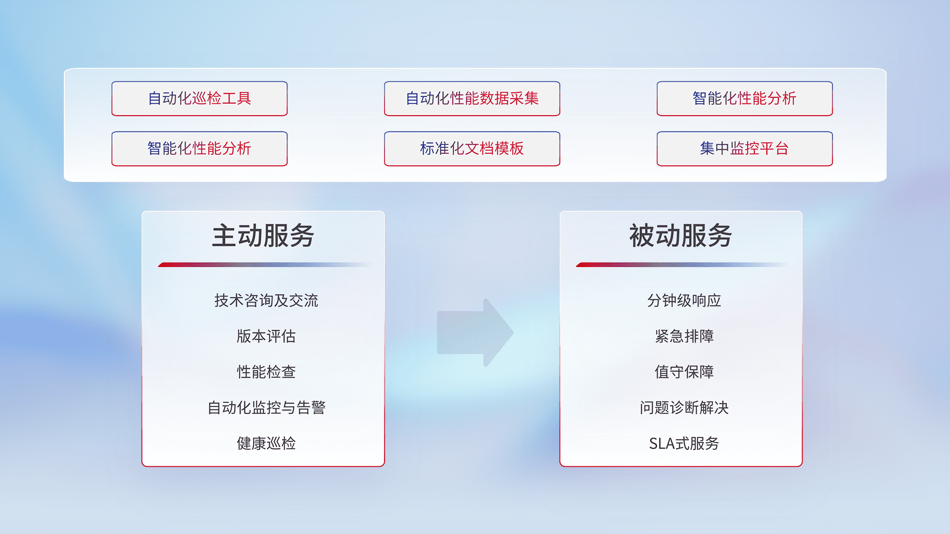 智能化工具和标准化文档,,,,保障服务质量,,,提供主动服务(包含技术咨询、、、版本评估、、、性能检查、、、自动化监控与告警、、、、健康巡检)和被动服务包含(分钟级响应、、紧急排障、、、值守保障、、问题诊断解决、、、SLA服务)。。